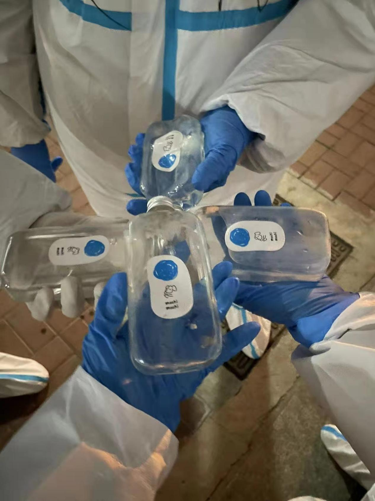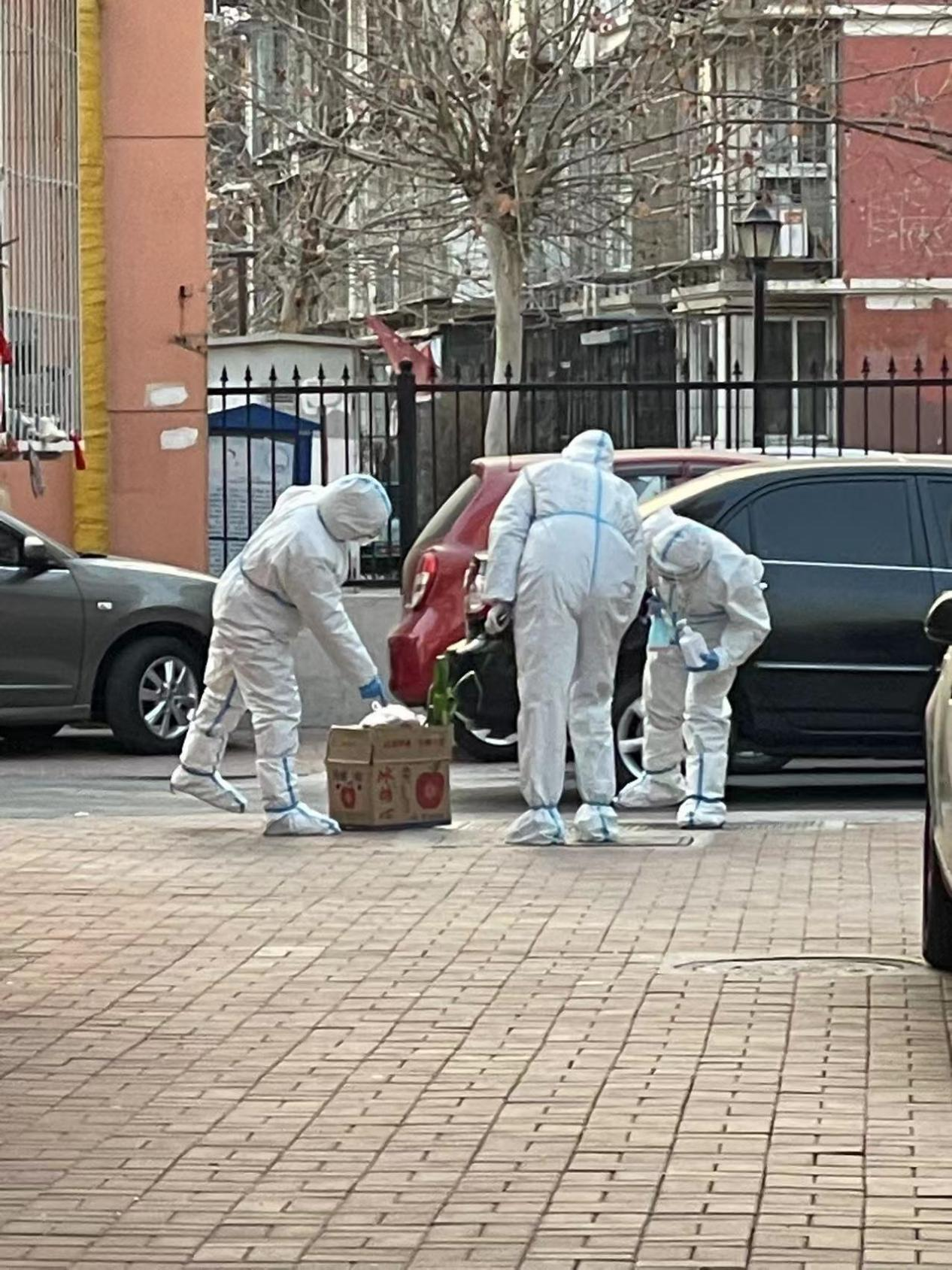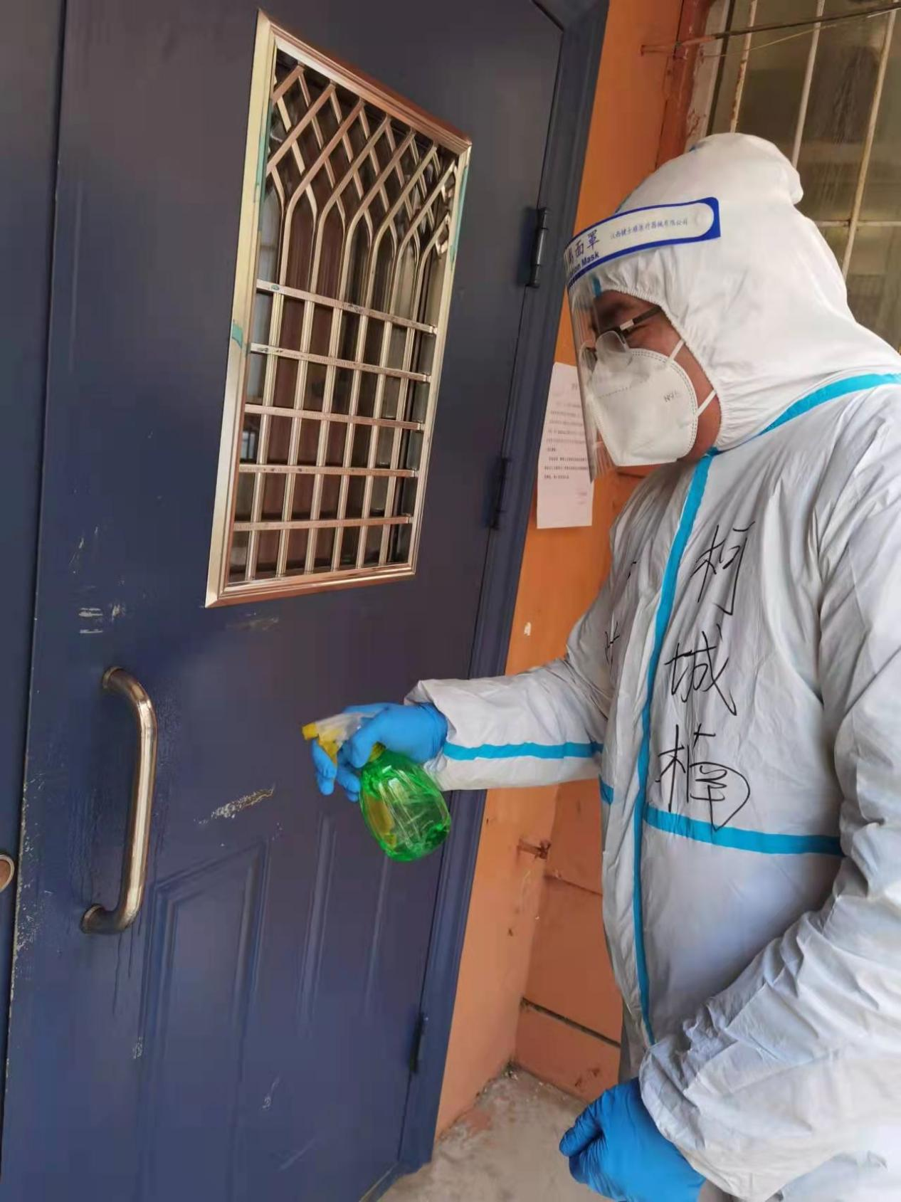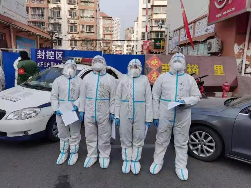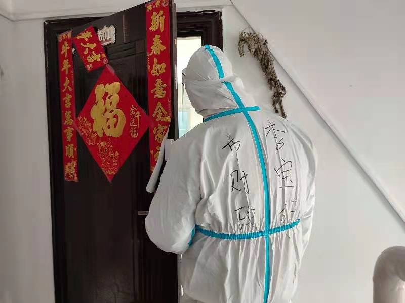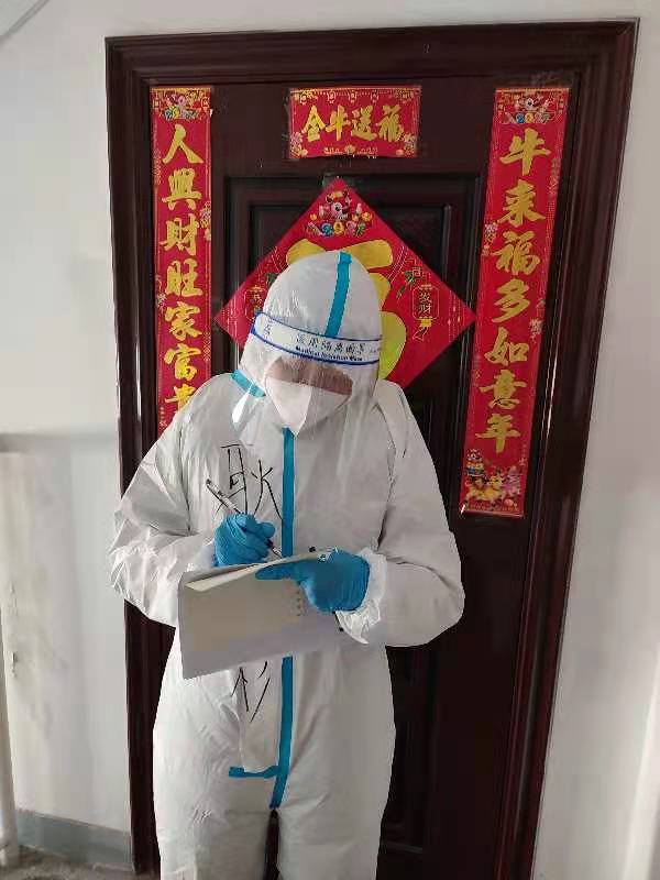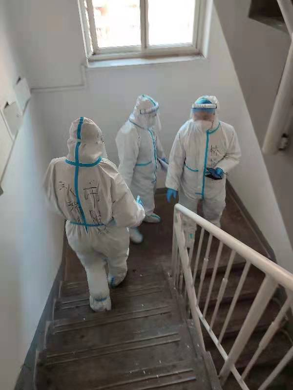 8点开始执勤。排查居民基本信息,梳理需求。他们身着防护服的背影坚定无畏。