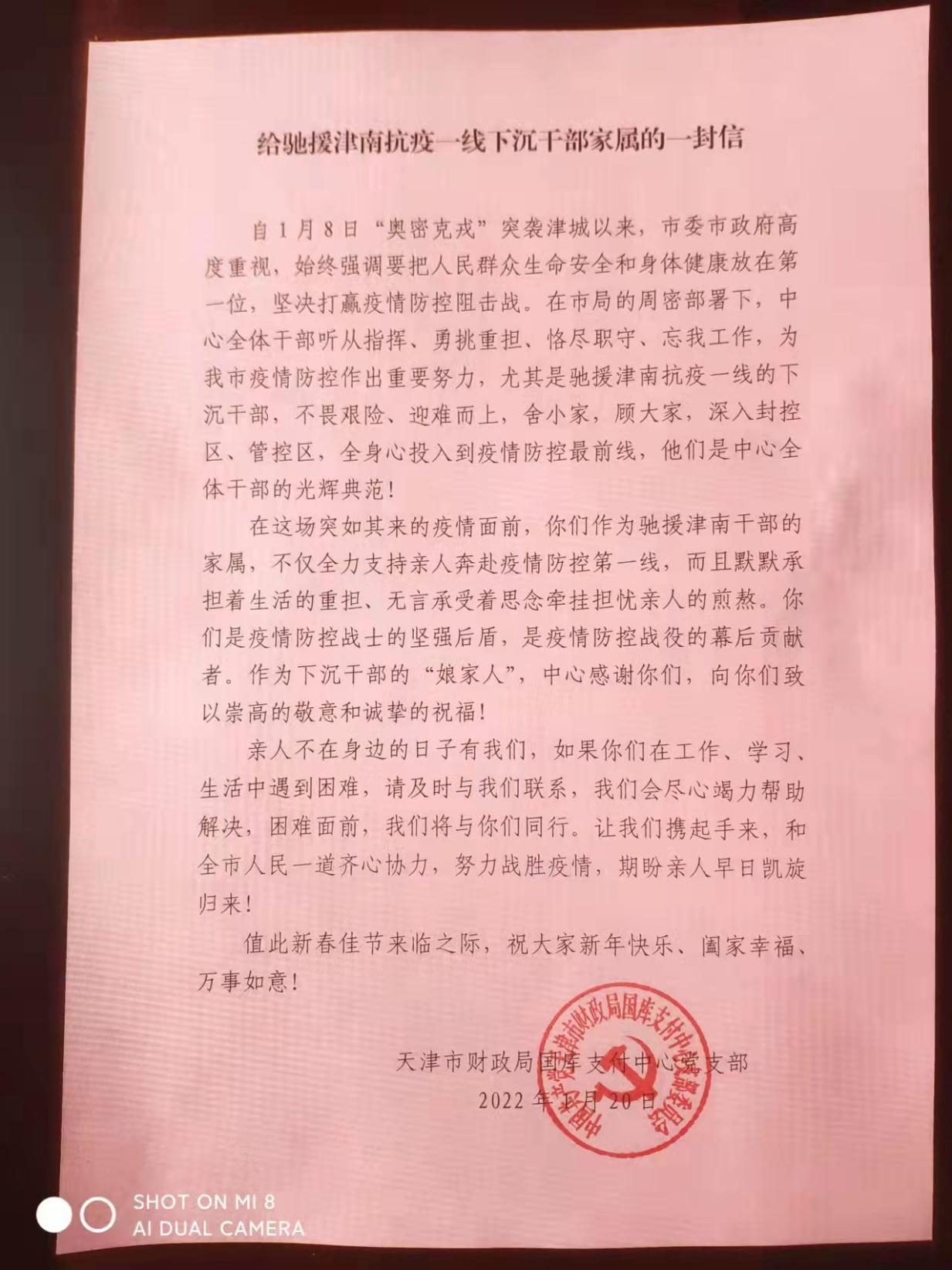 收到中心慰问信,干部们将它转发给家人,并表示感谢中心关怀,必将不辱使命。