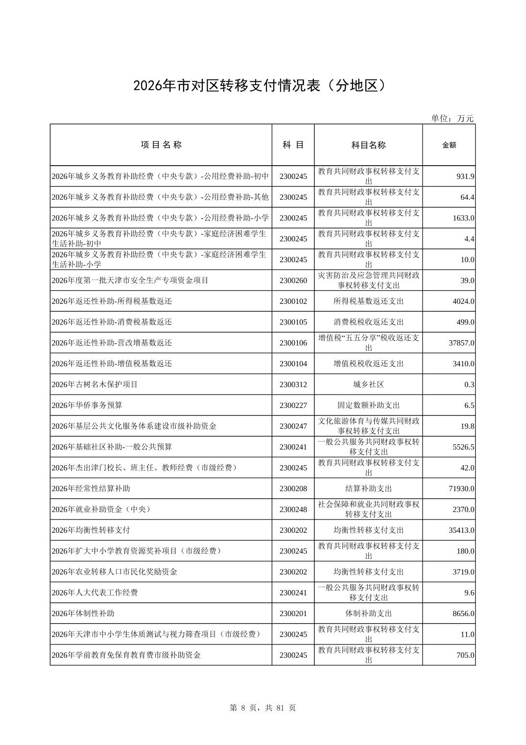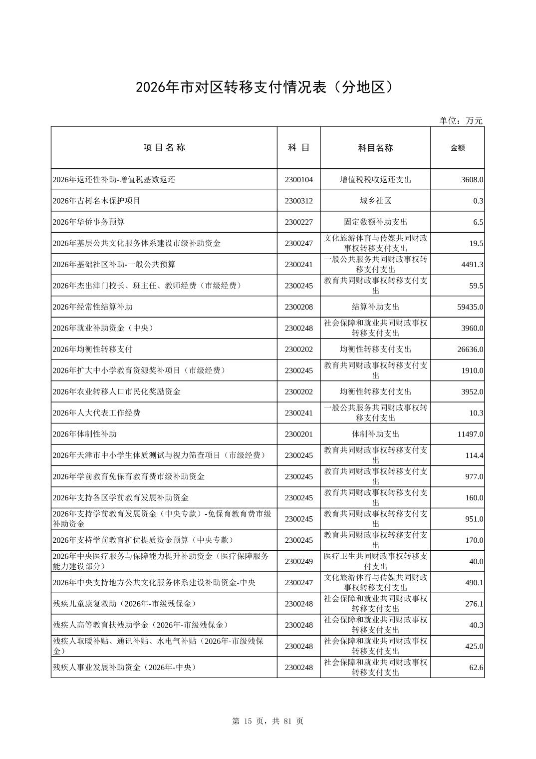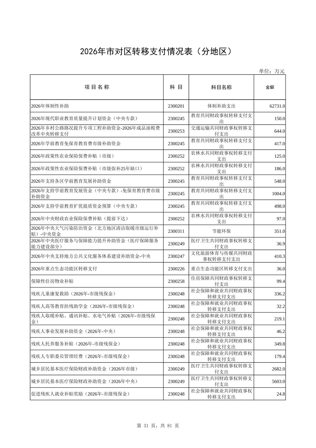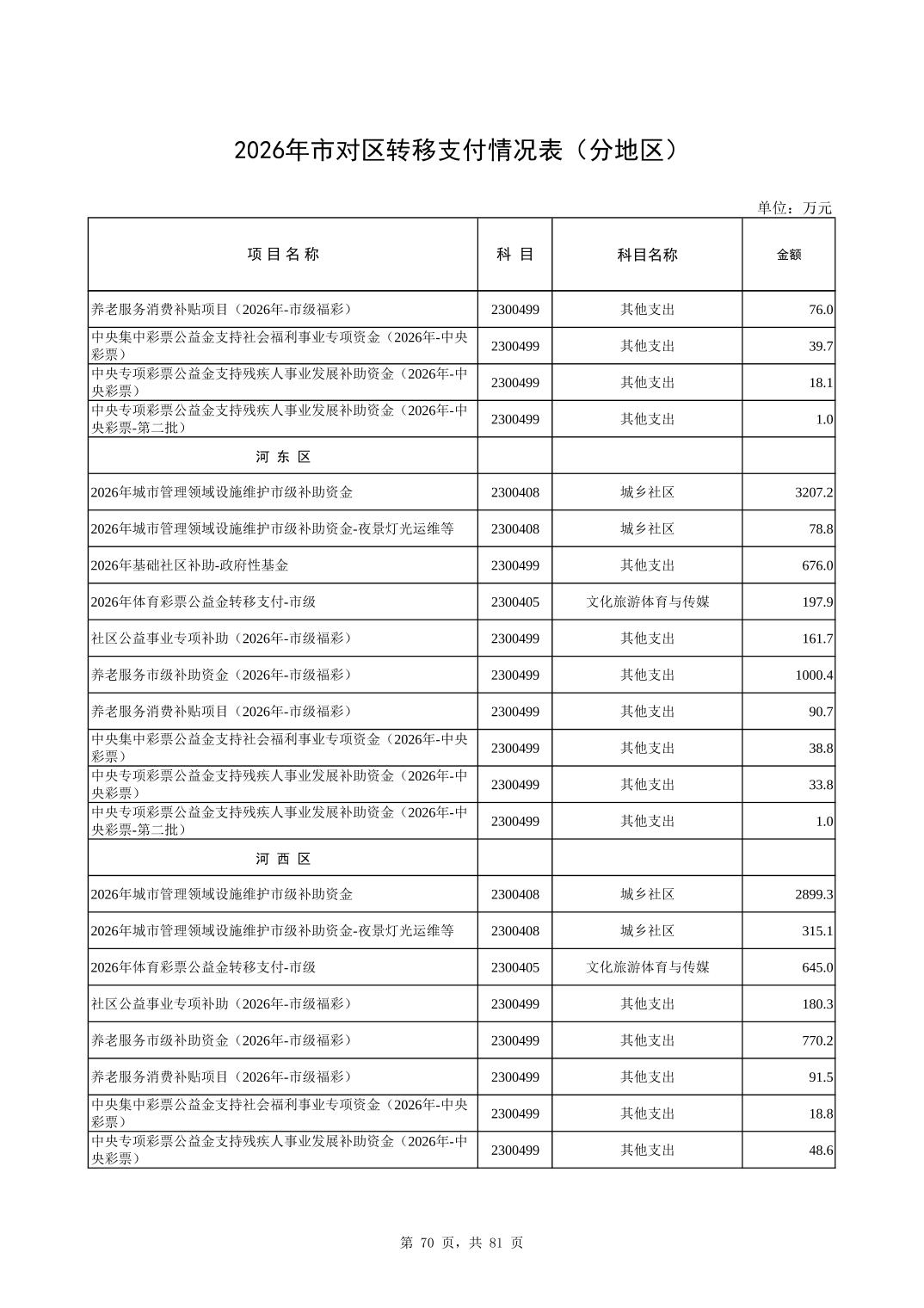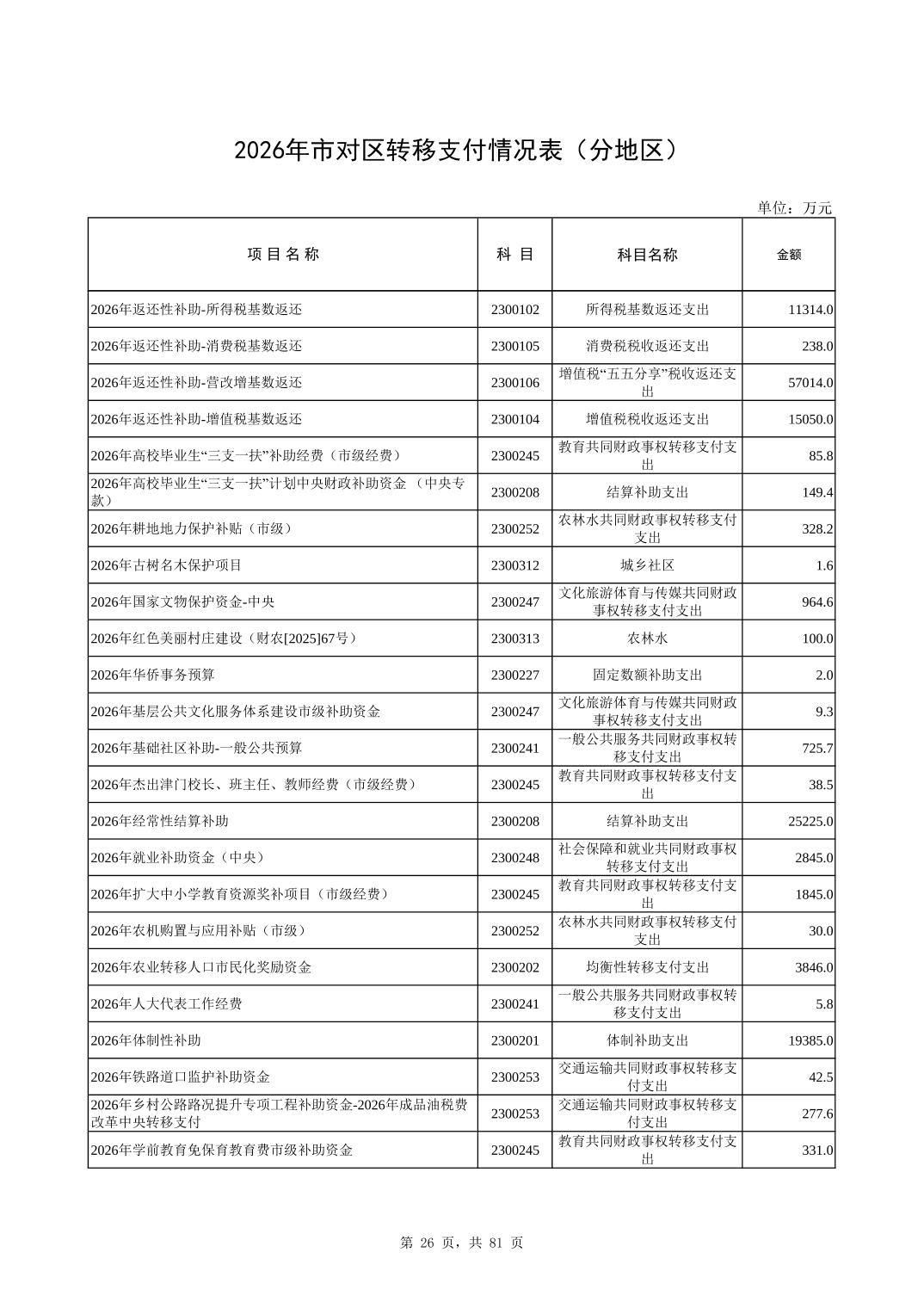 2026年市对区转移支付情况表(分地区)