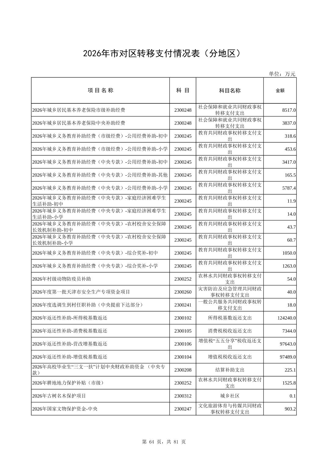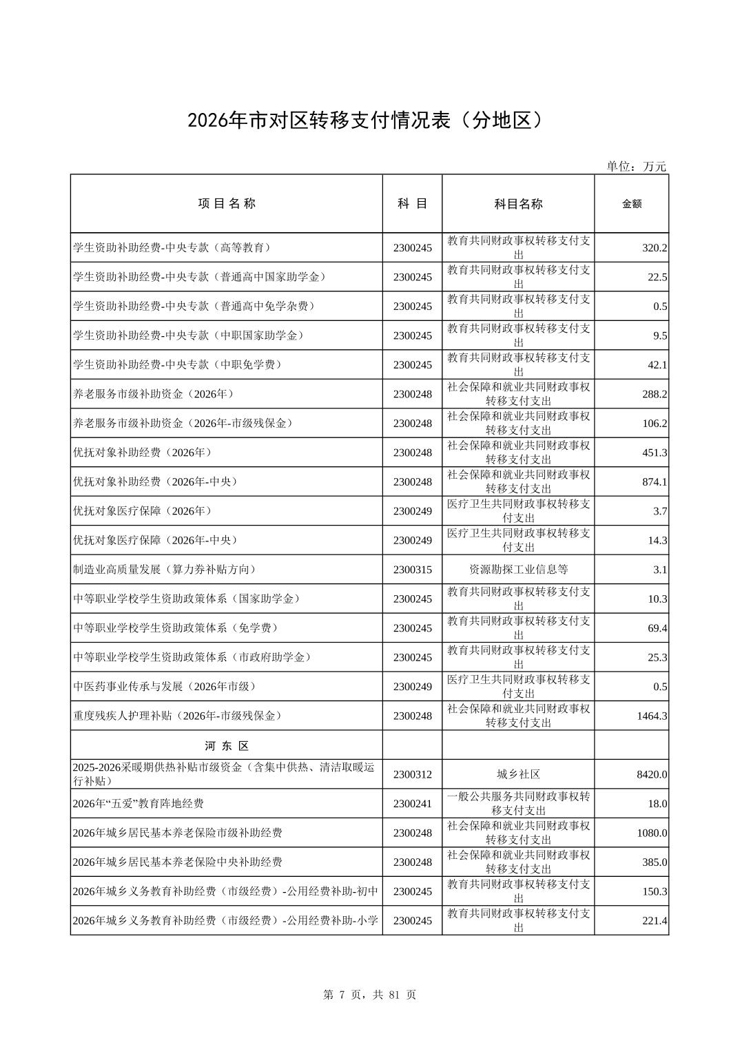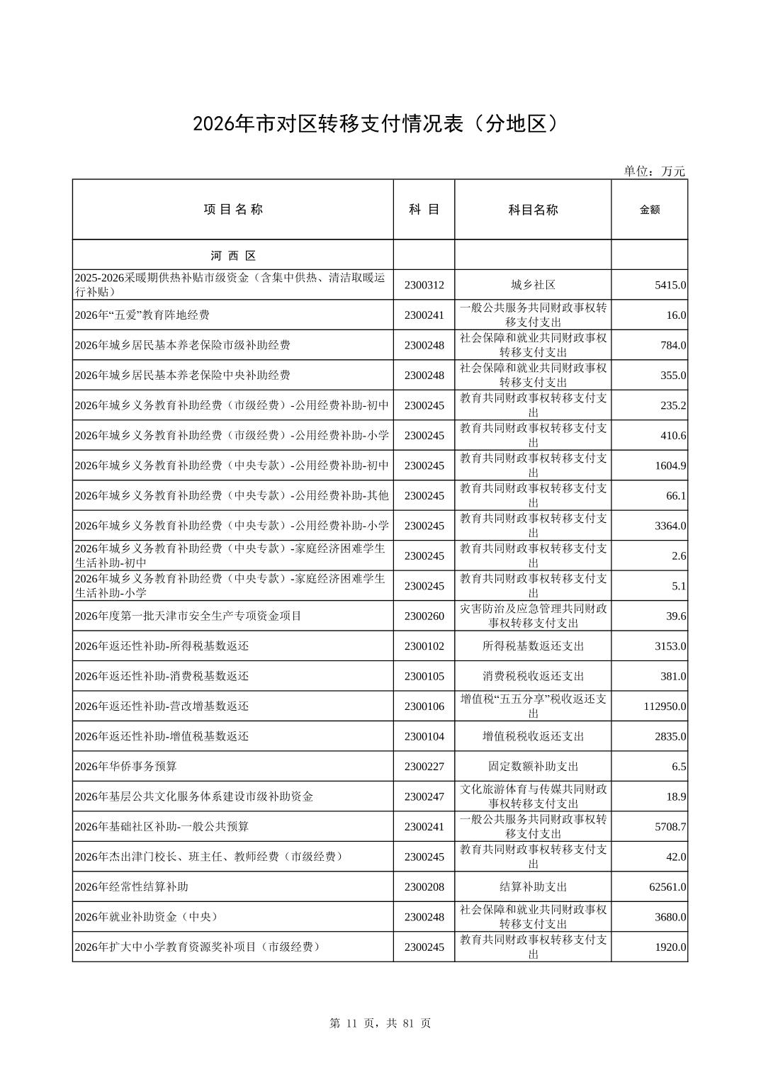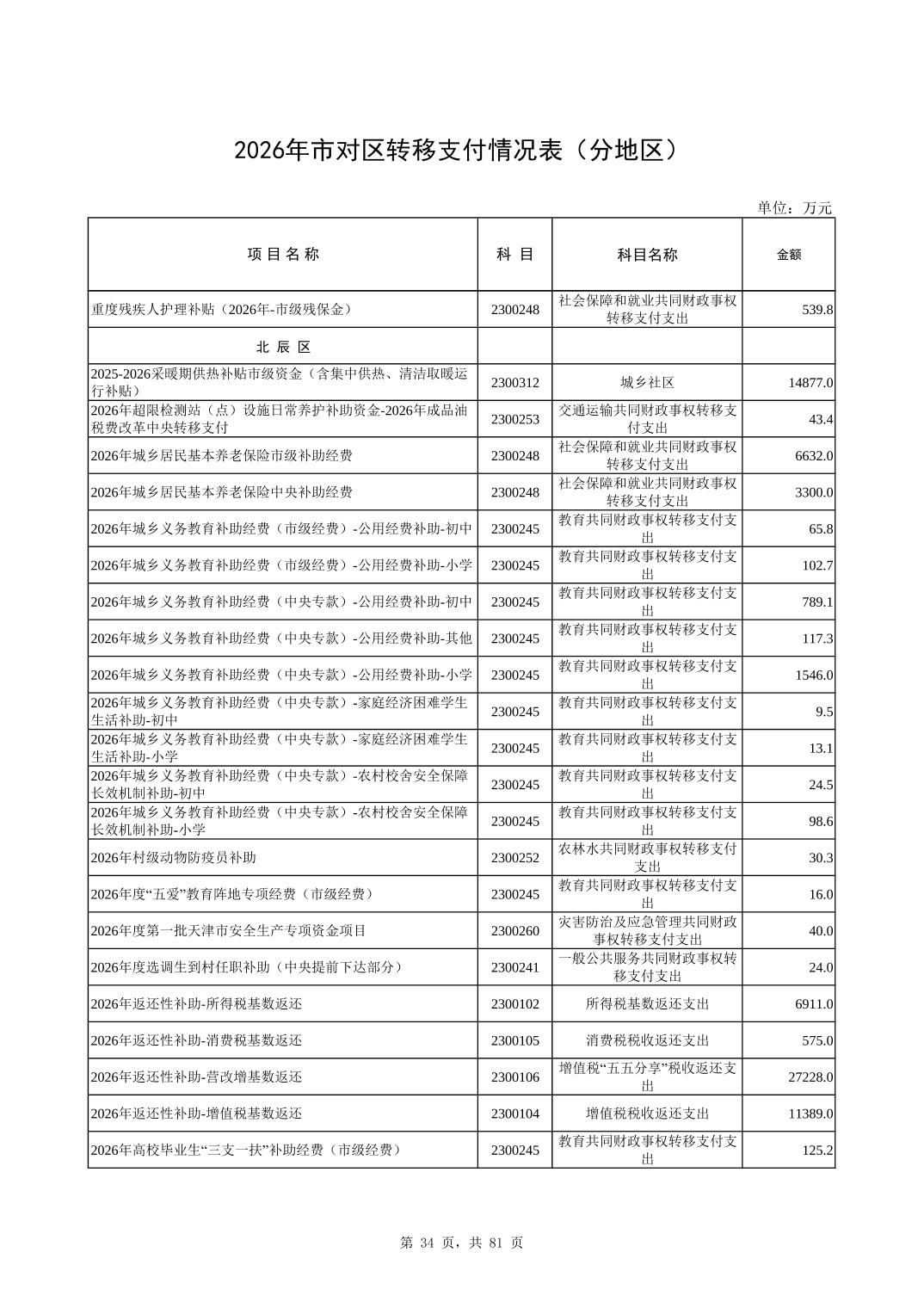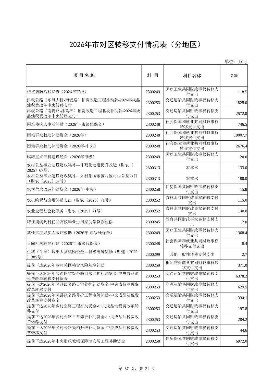 2026年市对区转移支付情况表(分地区)