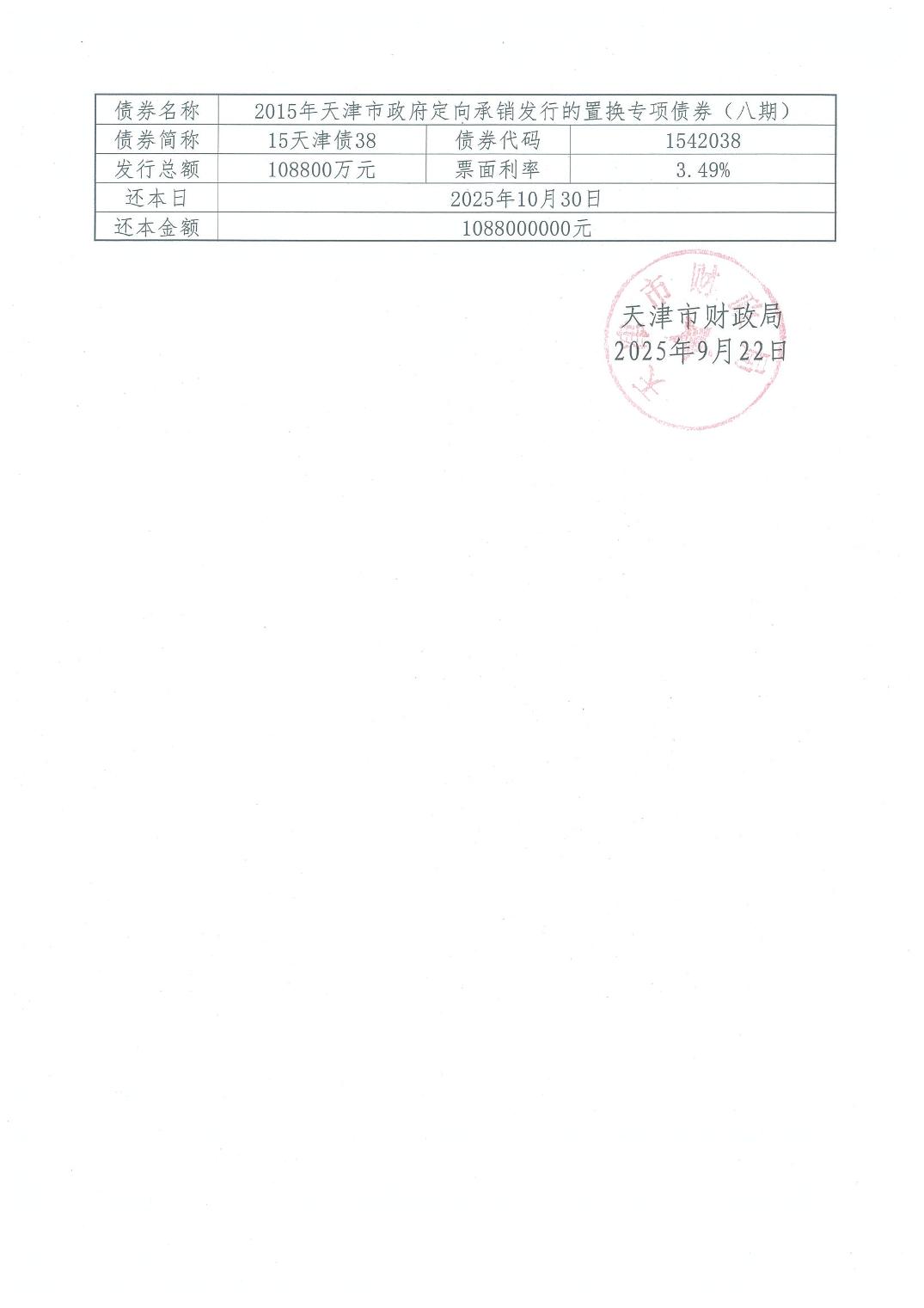 2025年10月天津市政府债券还本公告