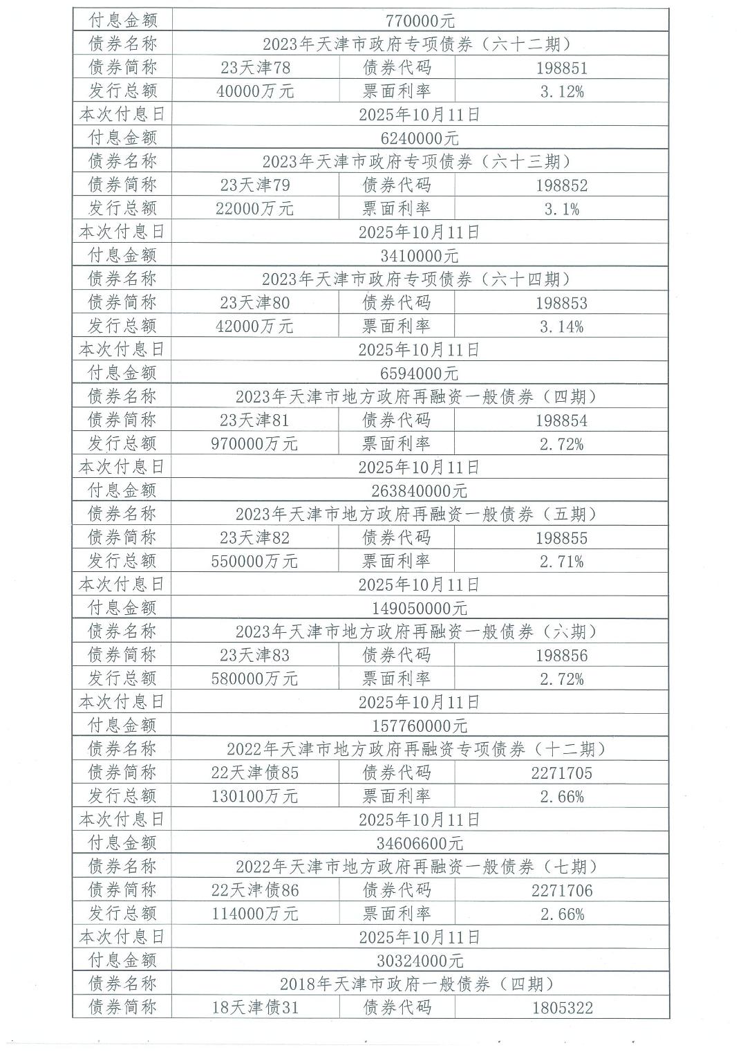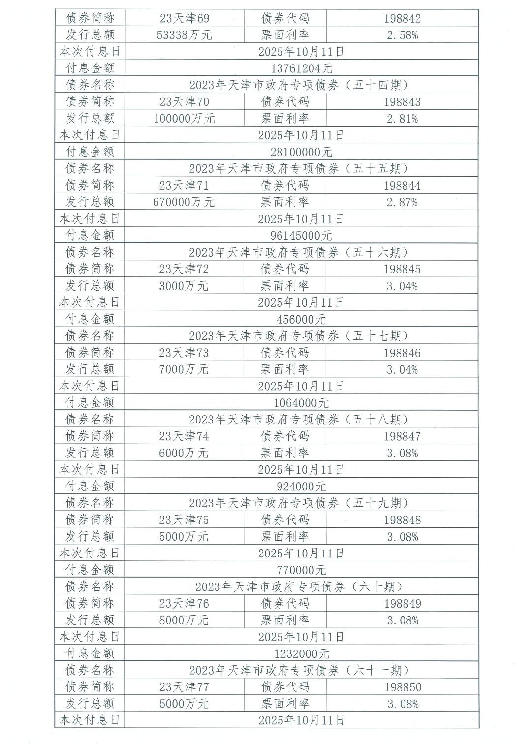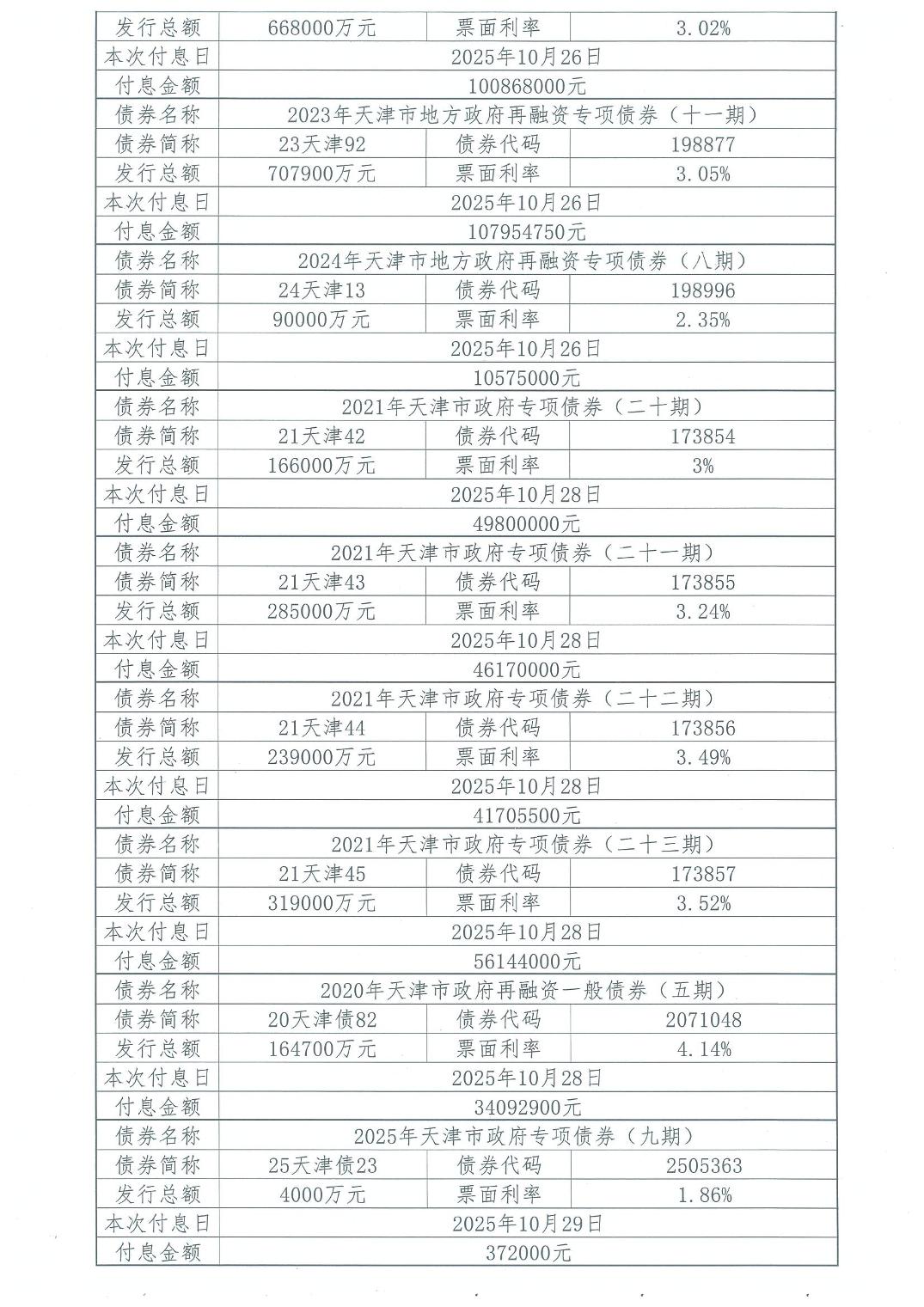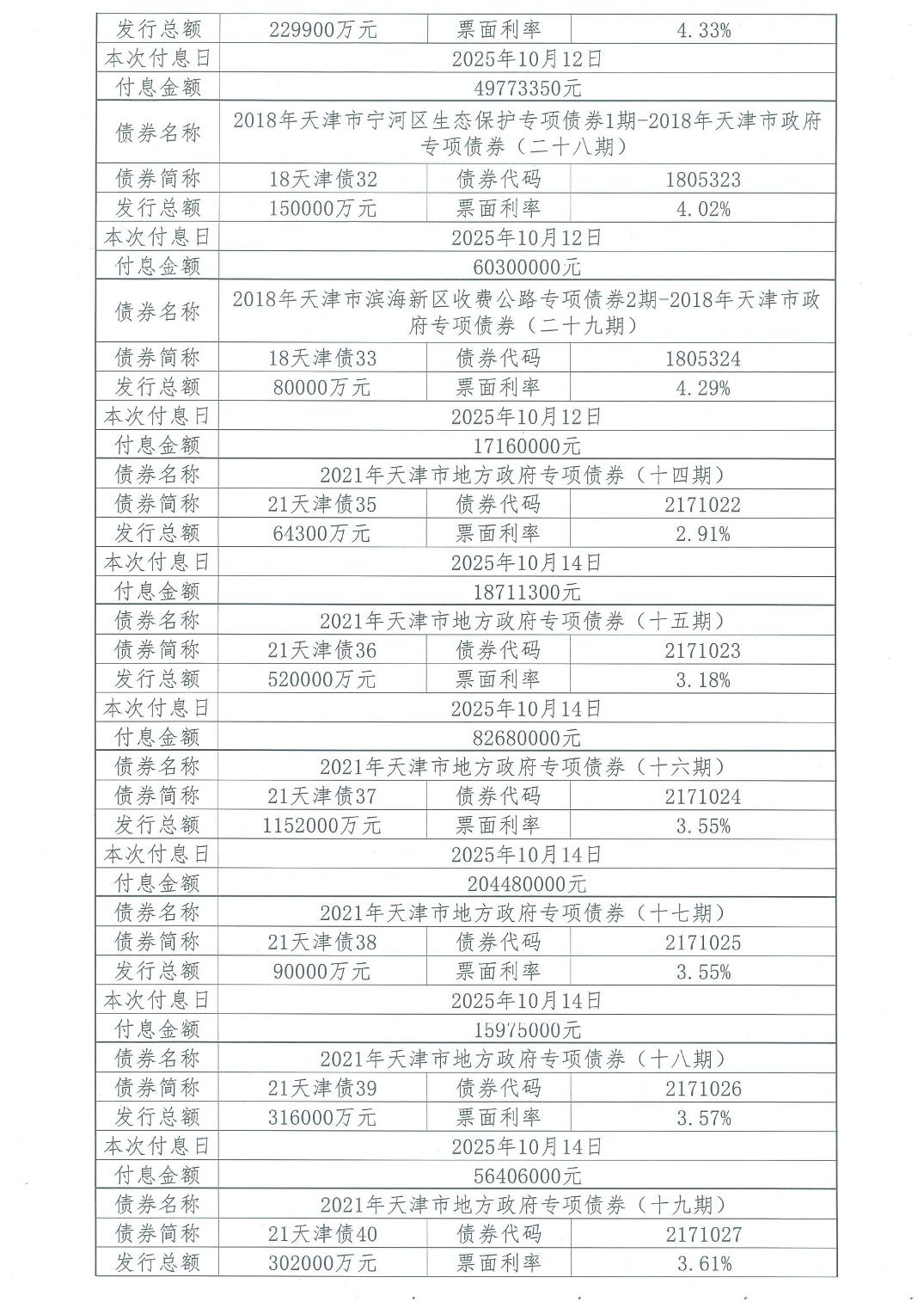 2025年10月天津市政府债券付息公告