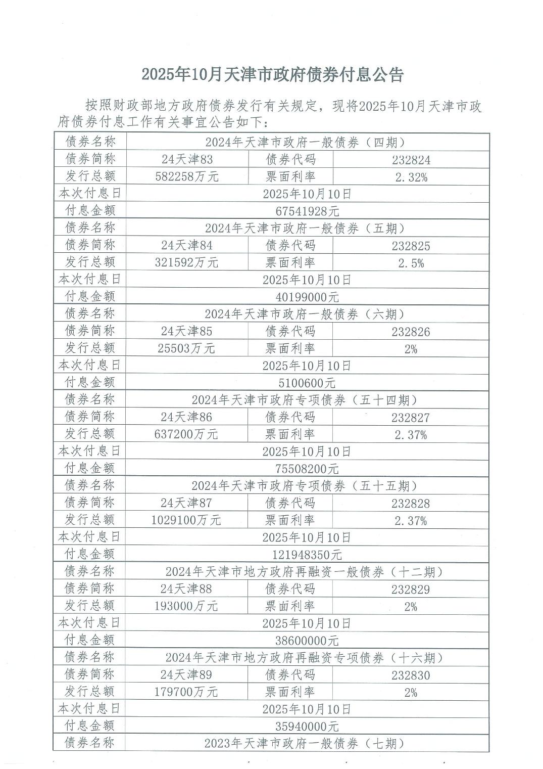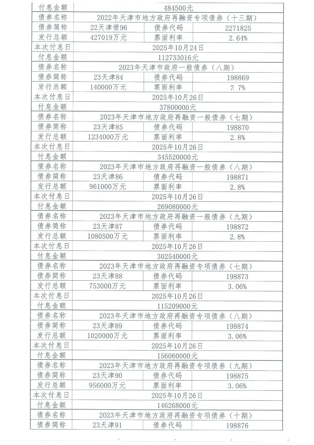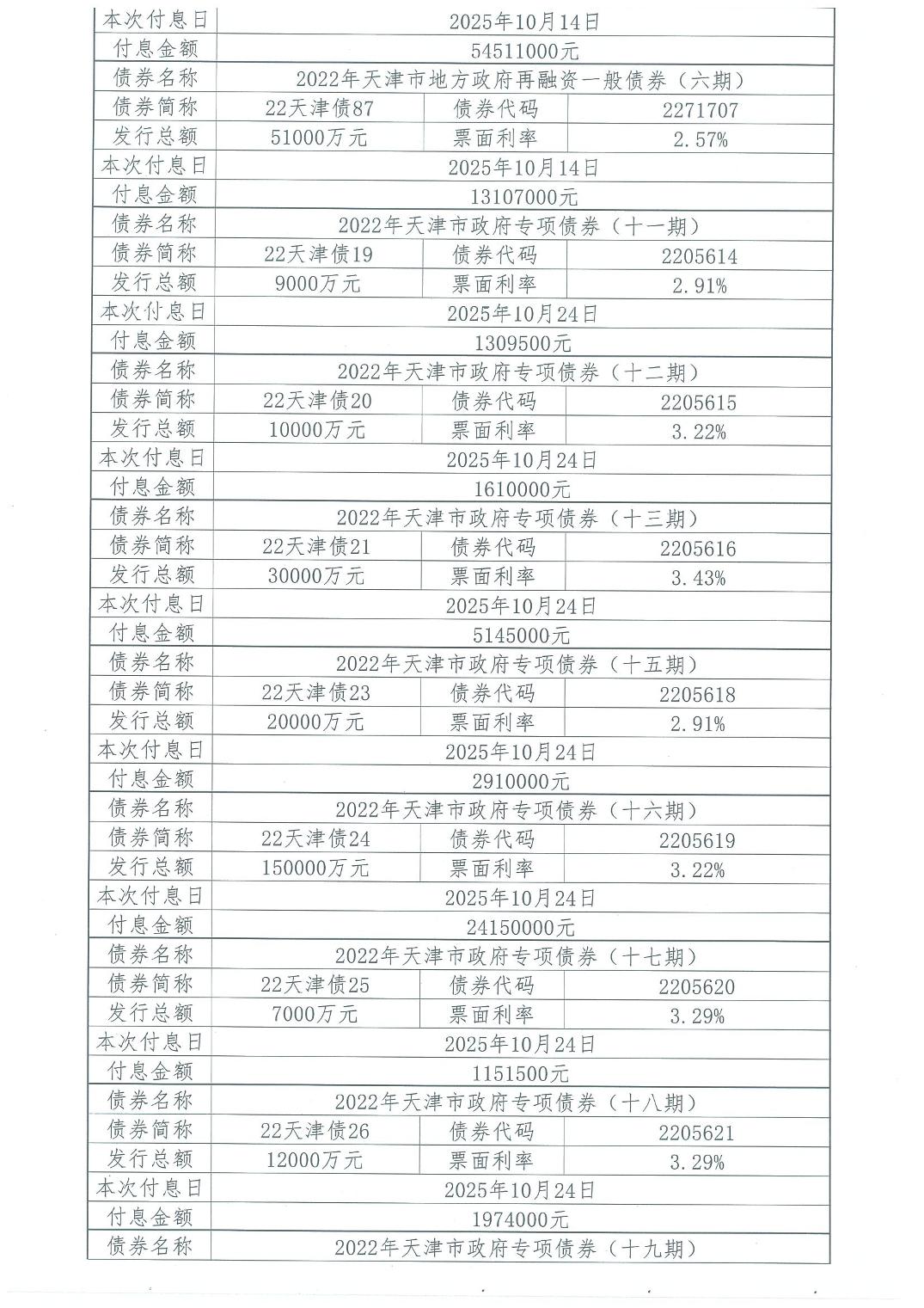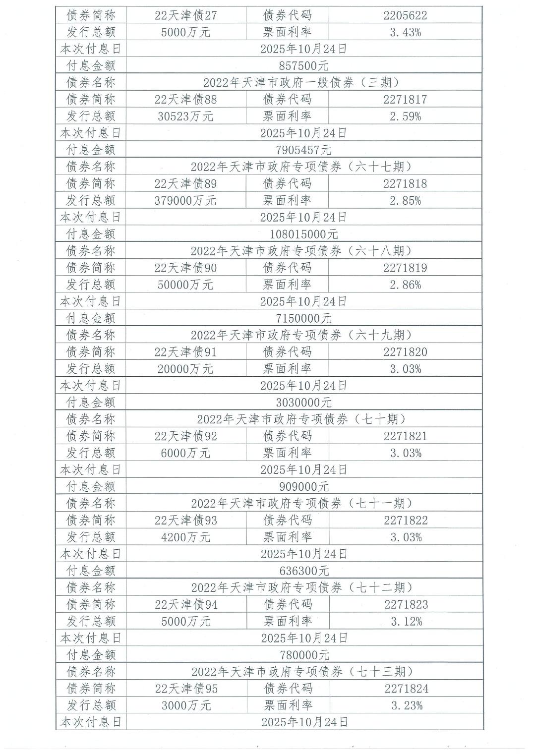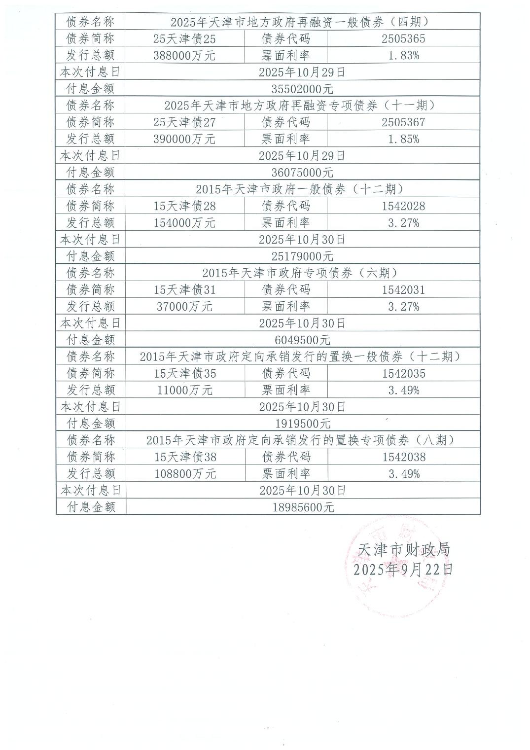 2025年10月天津市政府债券付息公告