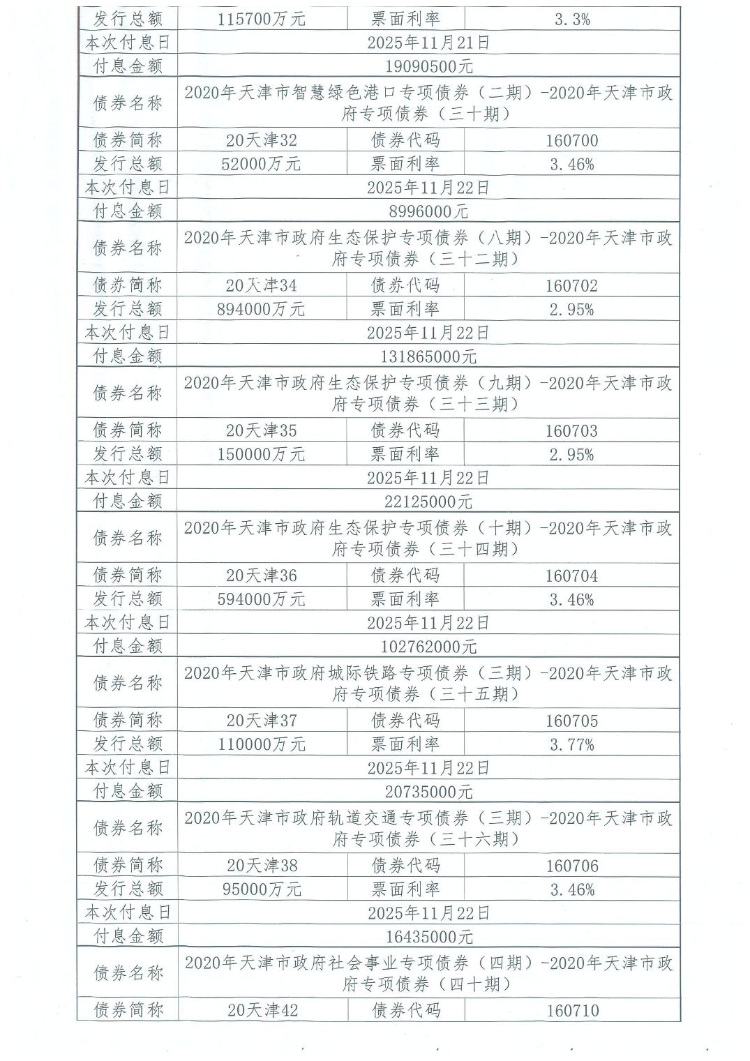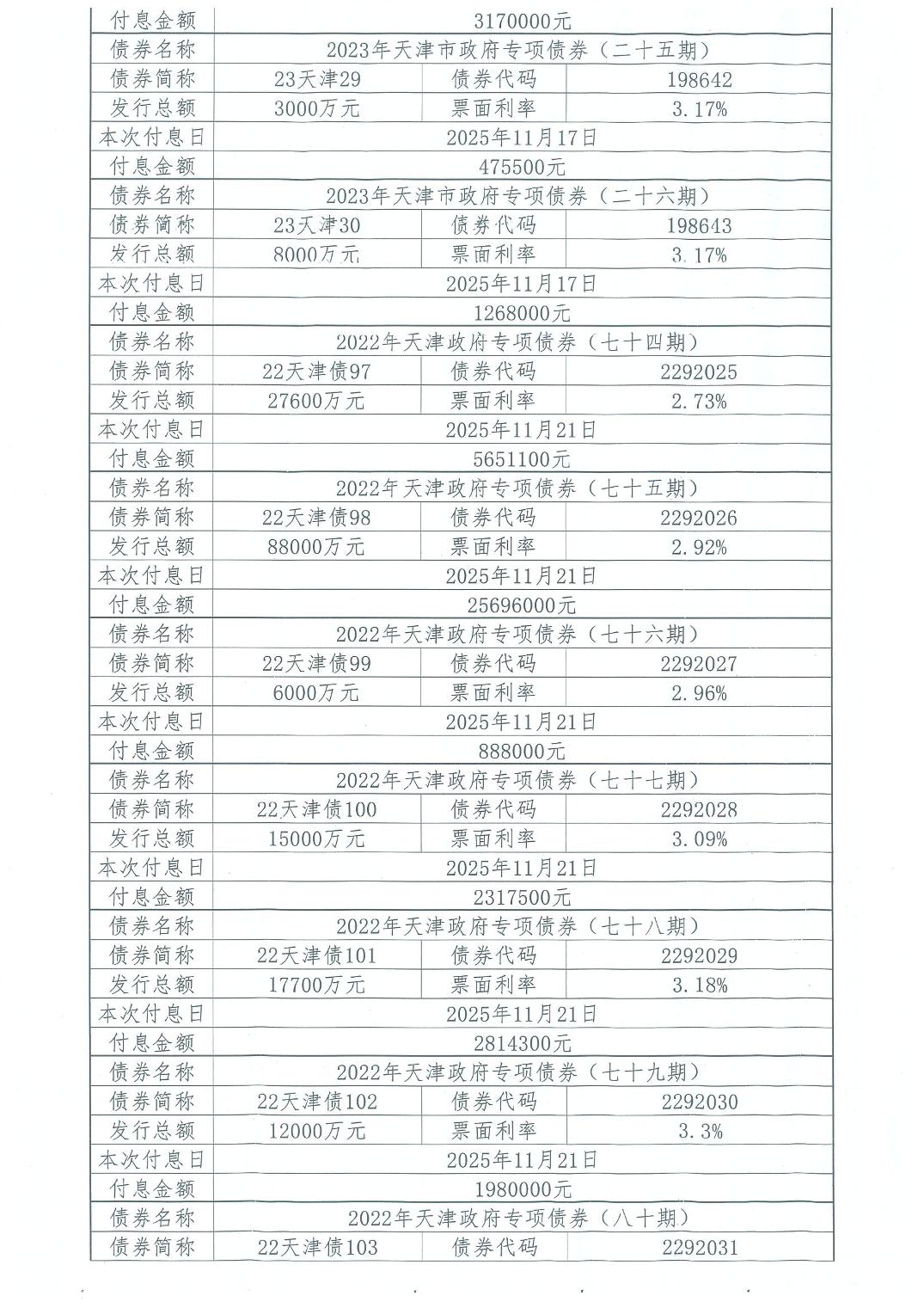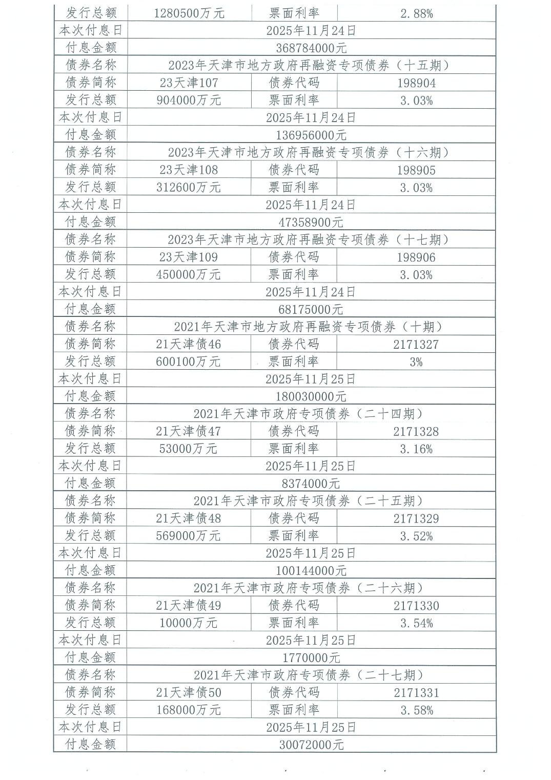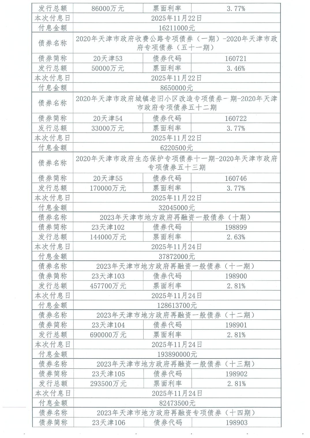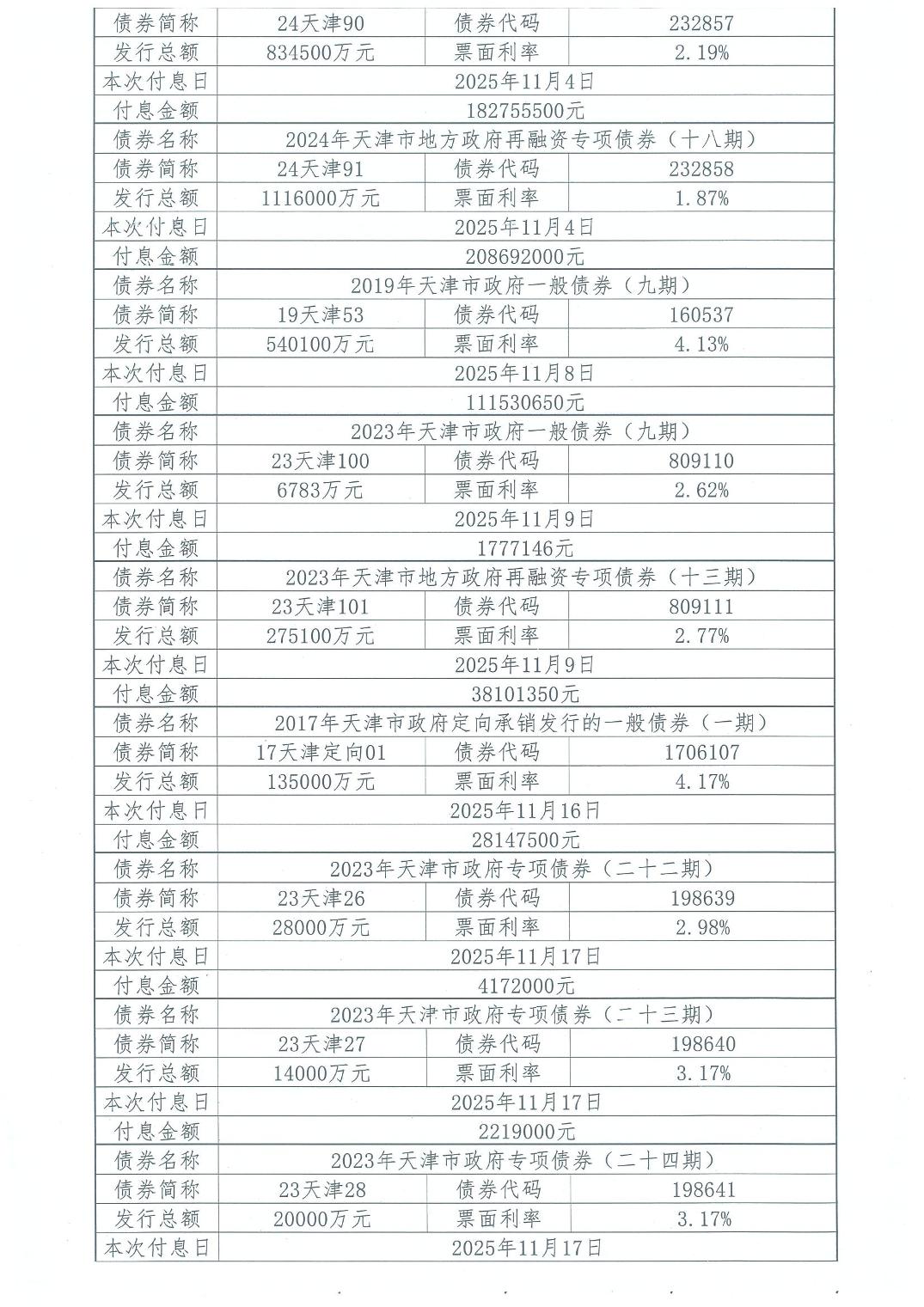 2025年11月天津市政府债券付息公告