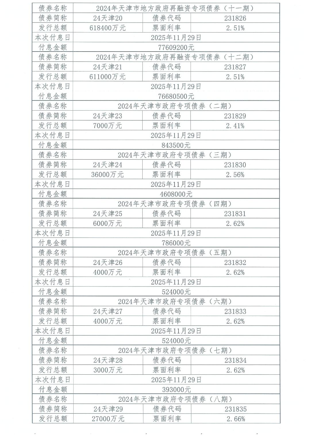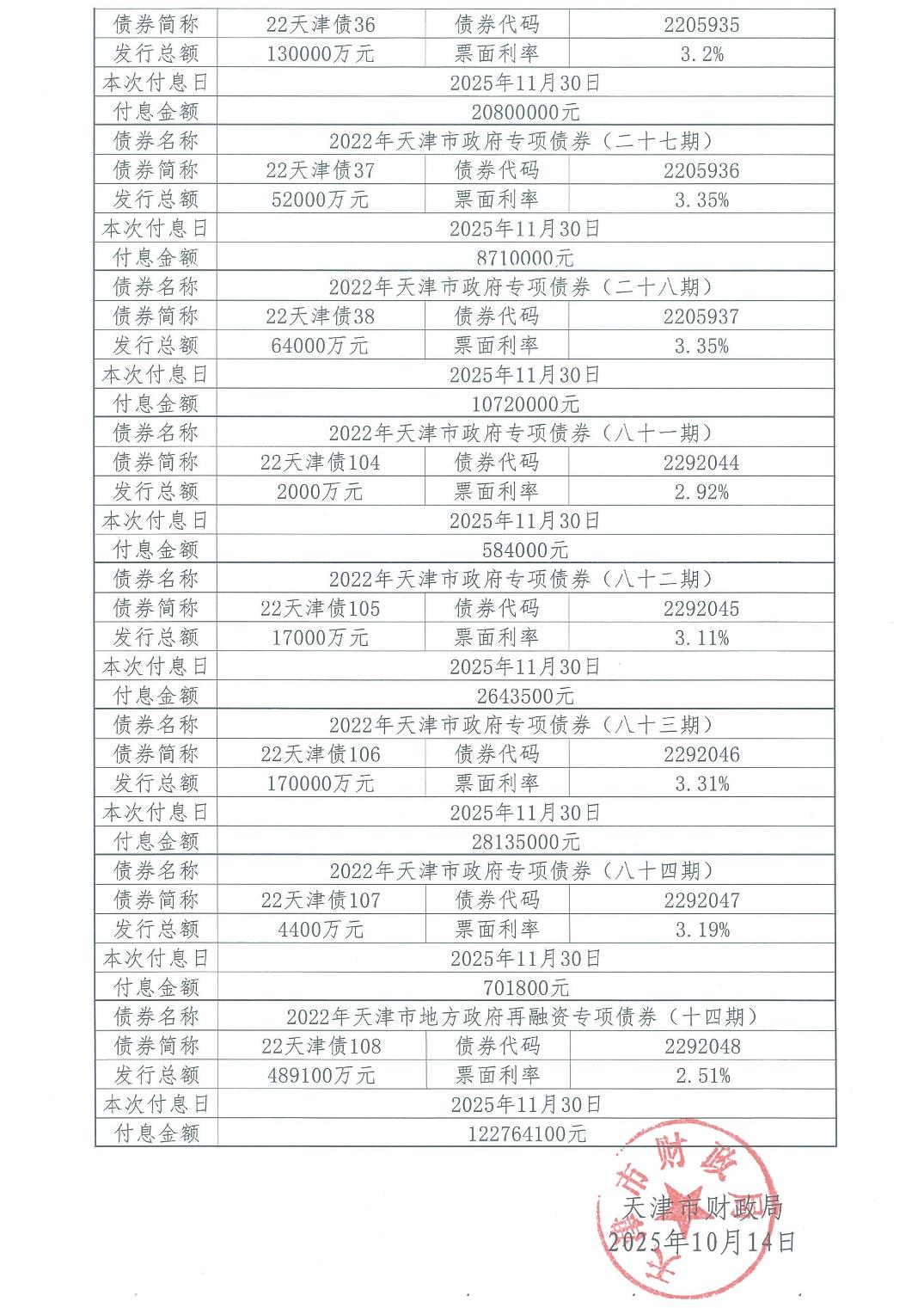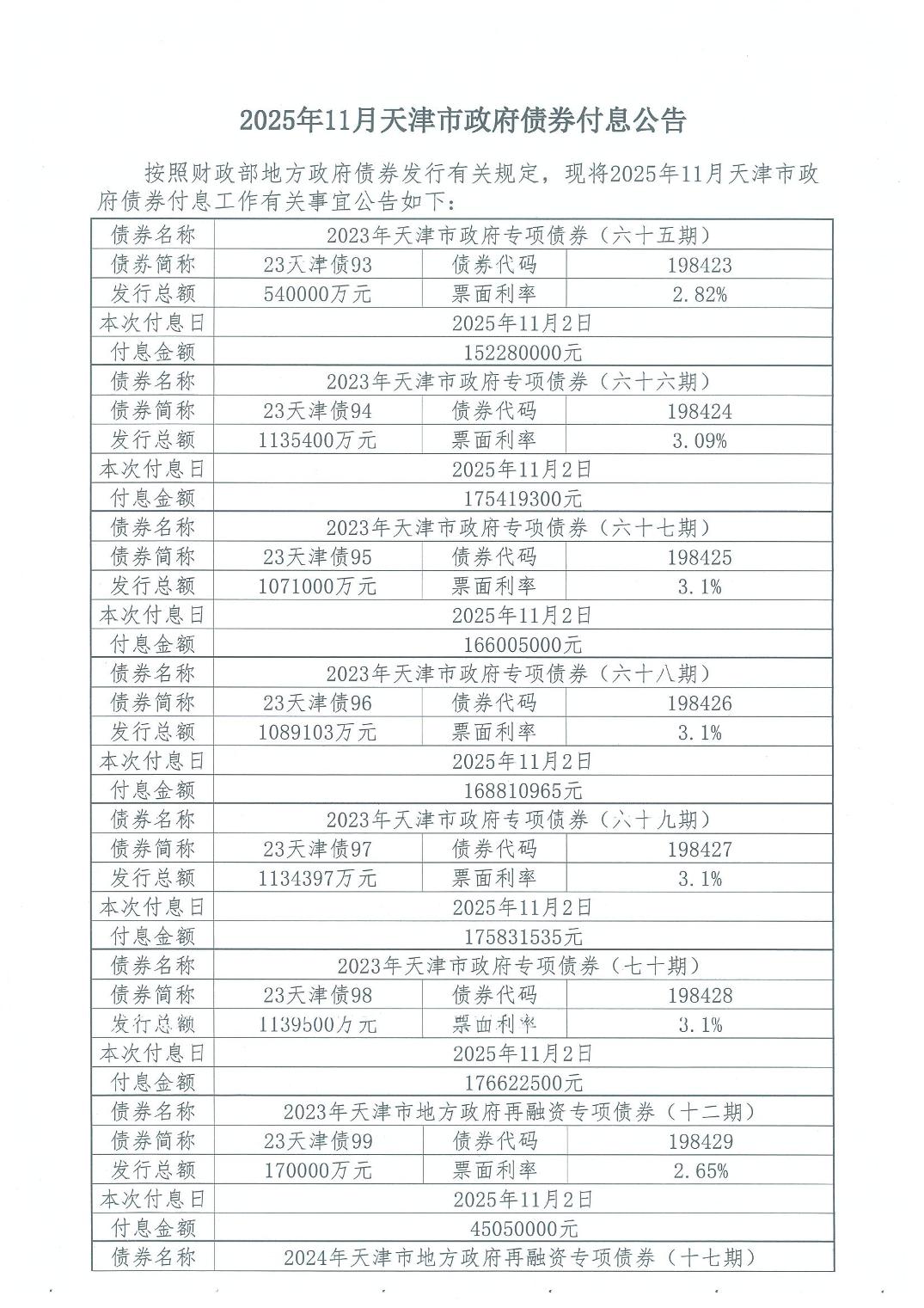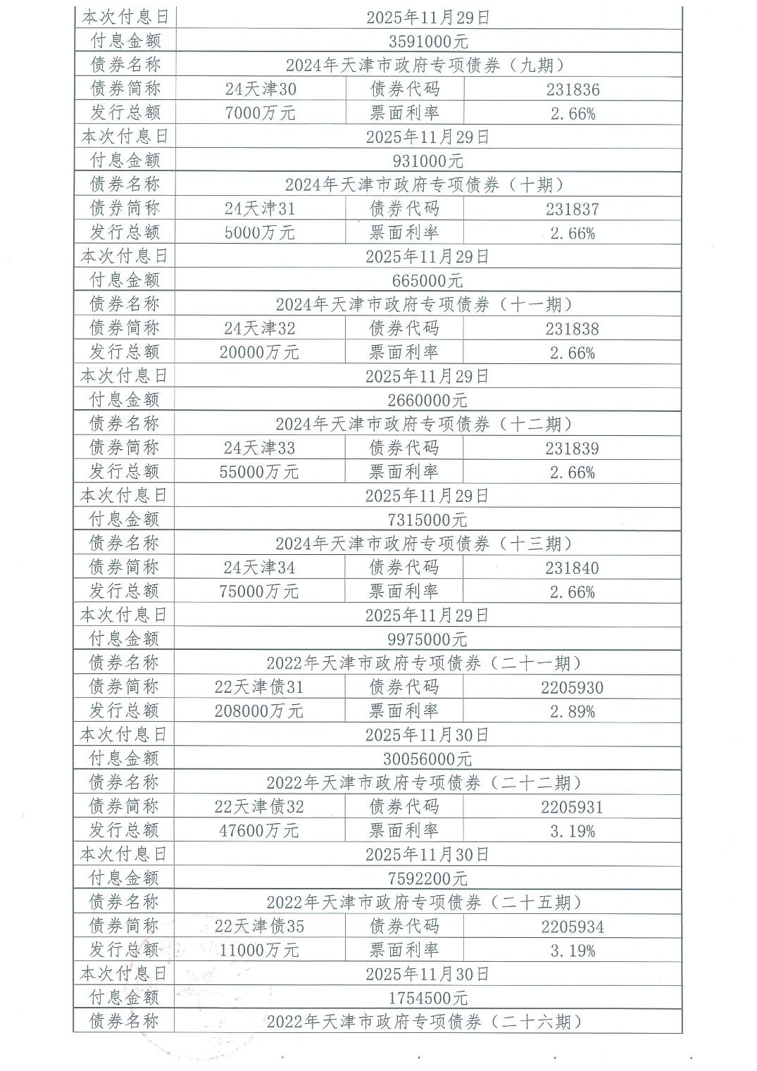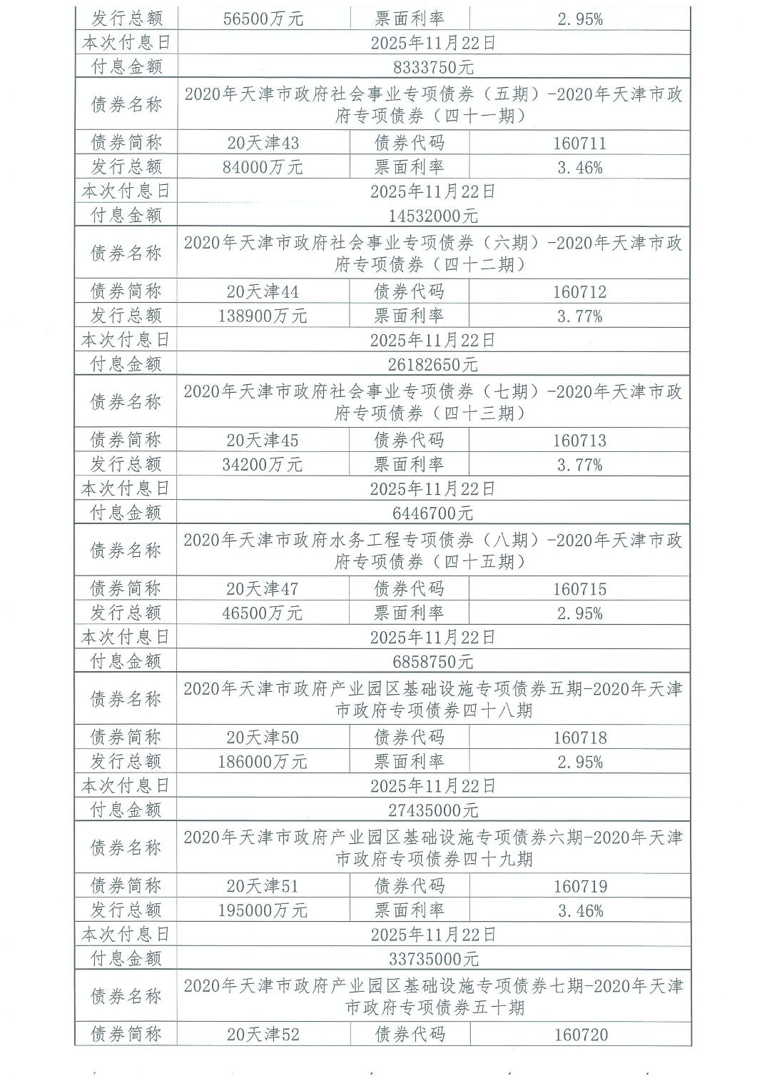 2025年11月天津市政府债券付息公告