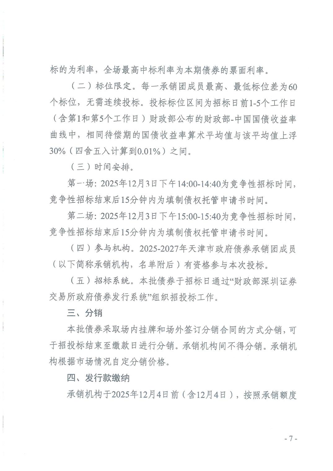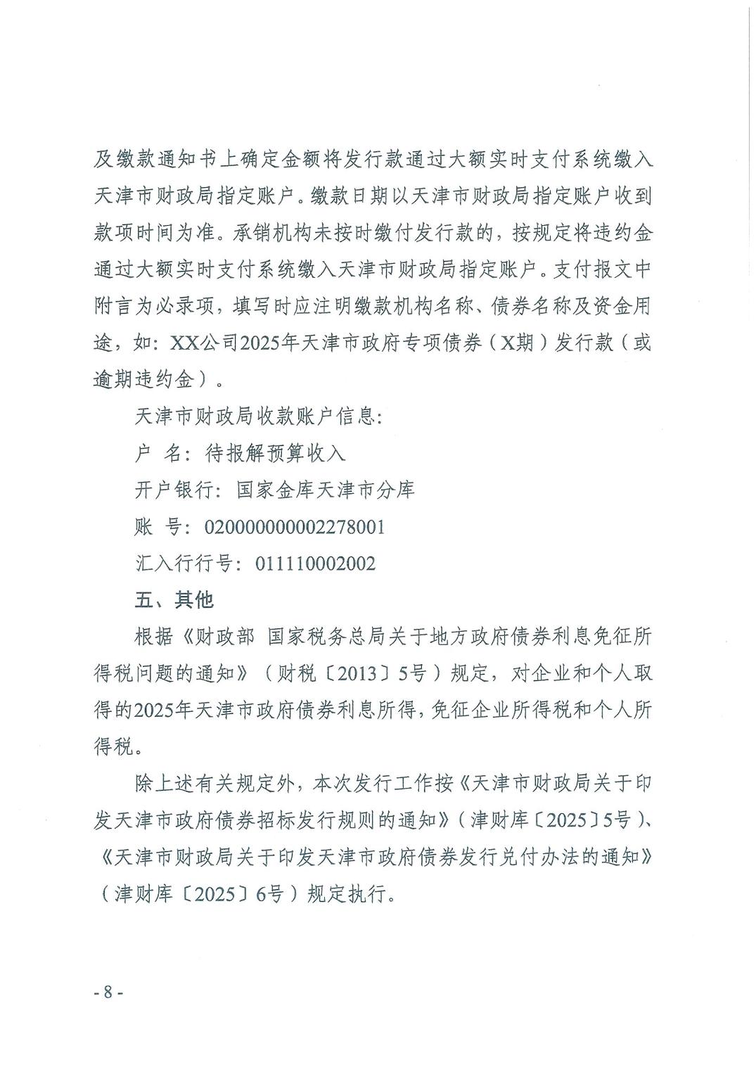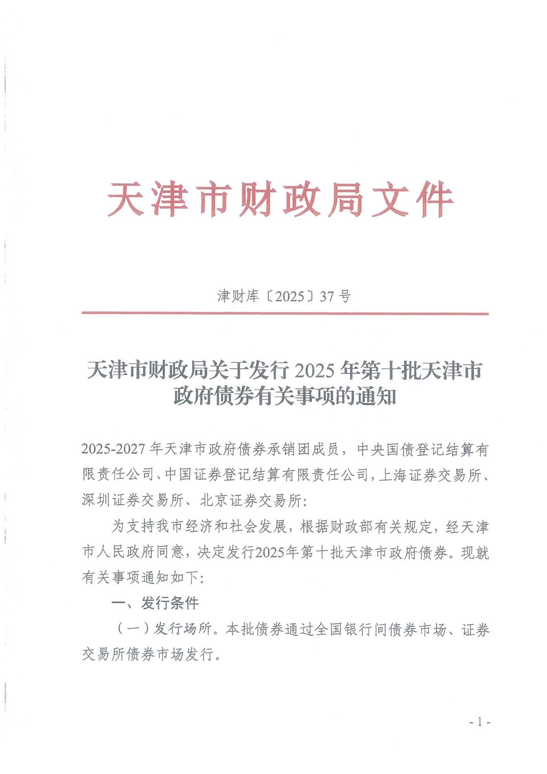 天津市财政局关于发行2025年第十批天津市政府债券有关事项的通知
