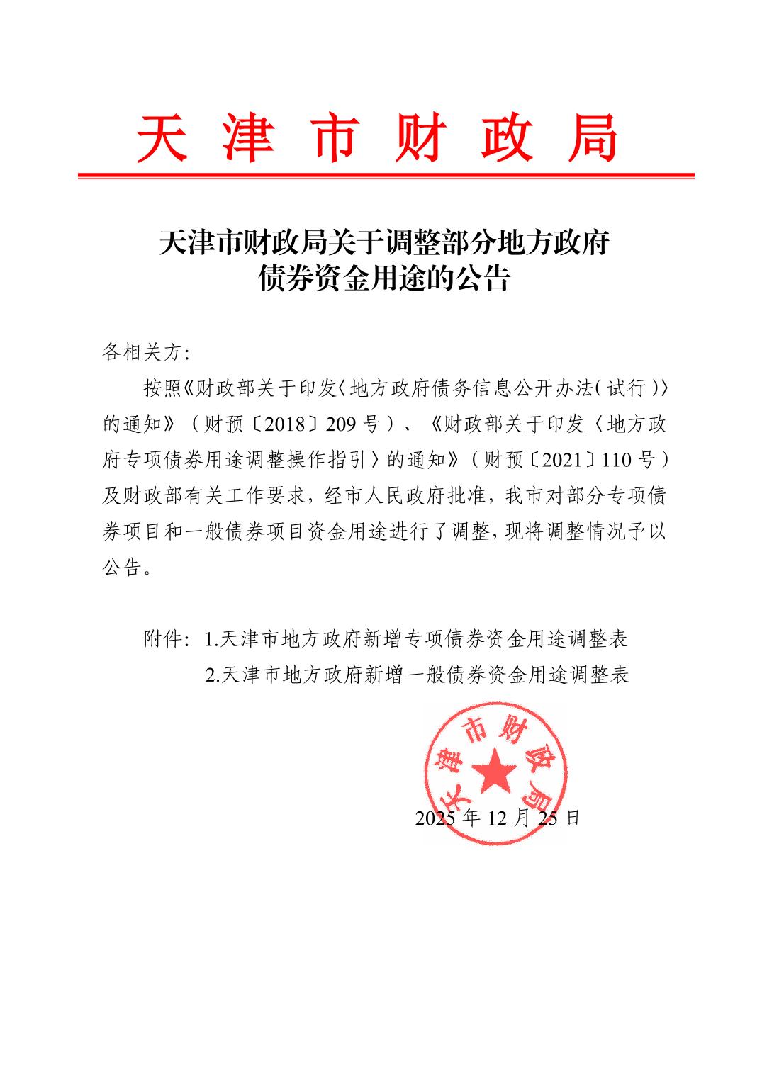 天津市财政局关于调整部分地方政府债券资金用途的公告