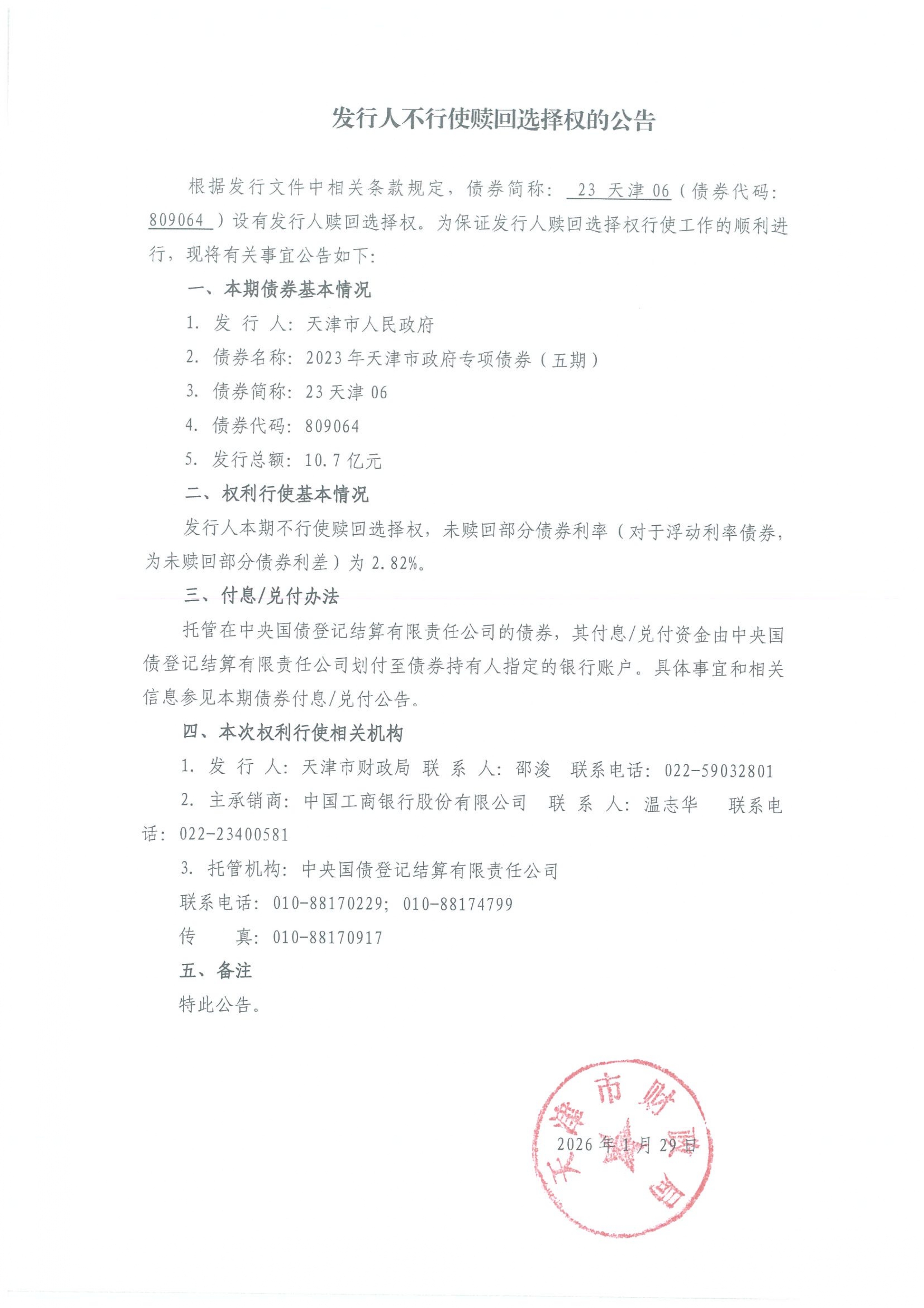 关于2023年天津市政府专项债券(五期)发行人不行使赎回选择权的公告