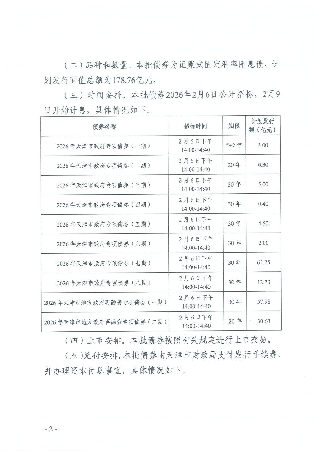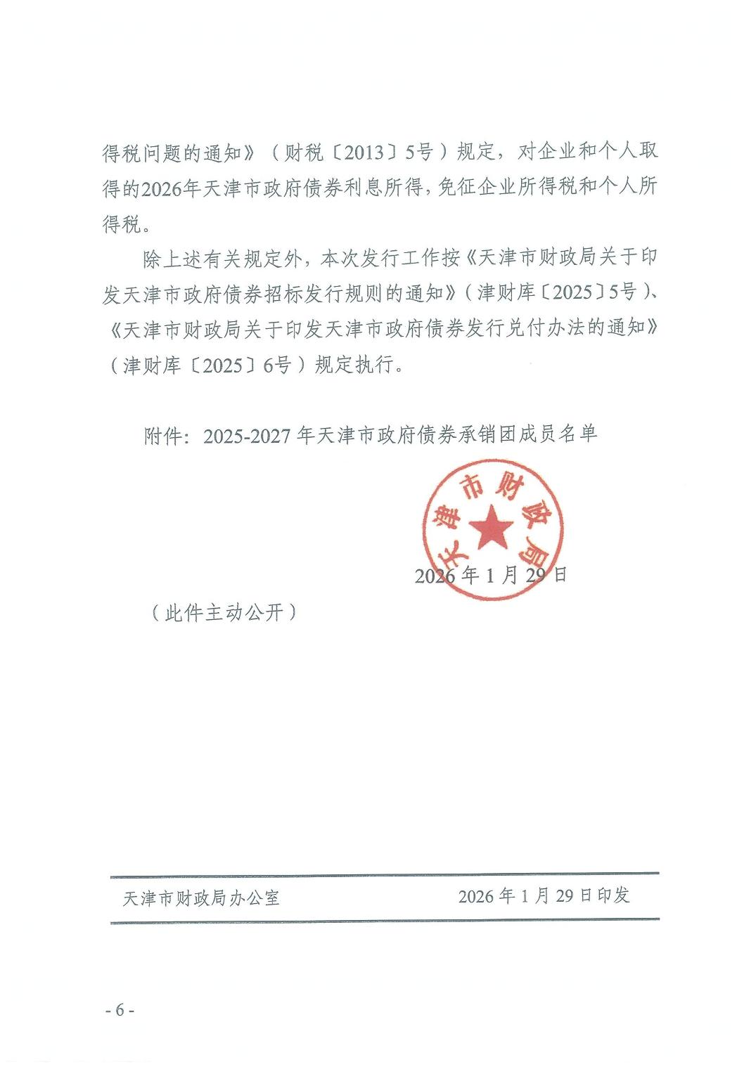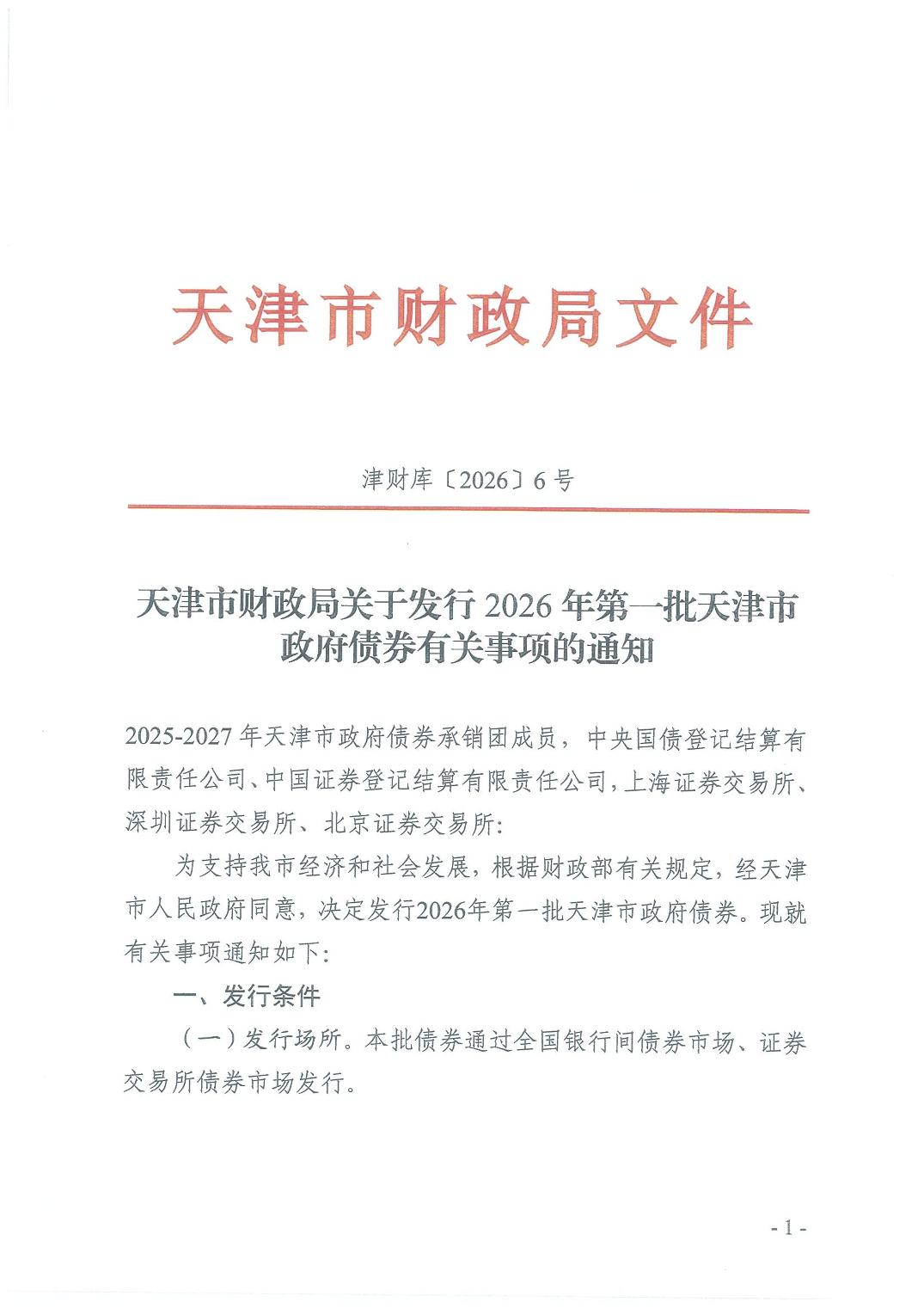 天津市财政局关于发行2026年第一批天津市政府债券有关事项的通知